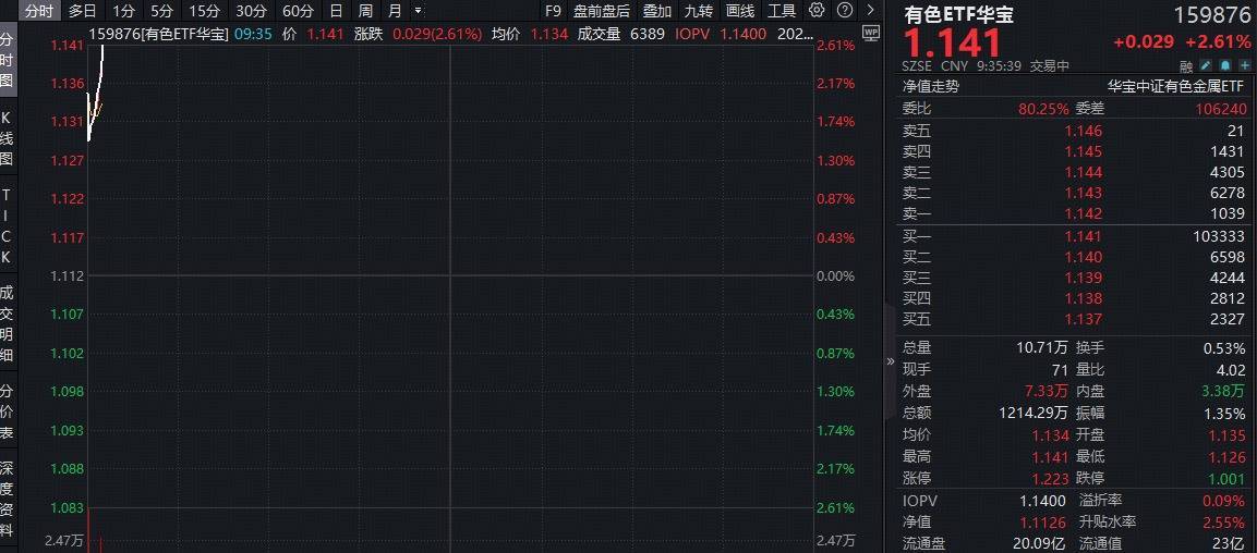 或由于中国央行连续15个月增持黄金,今日(2月9日)揽尽有色金属行业龙头的有色ETF华宝(159876)强势上涨,场内价格现涨2.61%,盘中收复5日均线。