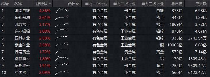 成份股方面,湖南白银领涨超4%,盛和资源、北方稀土、兴业银锡涨逾3%,国城矿业、紫金矿业涨超2%,湖南黄金、创新新材、恒邦股份等个股跟涨。